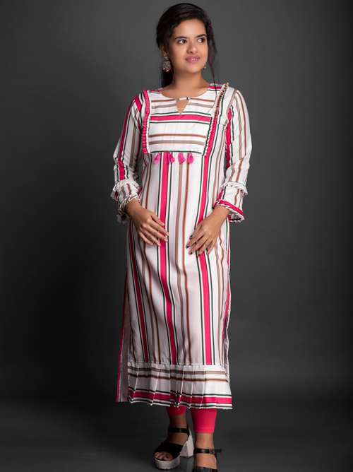 - Grab this beautiful kurta made up of rayon fabric featuring round neck designs.