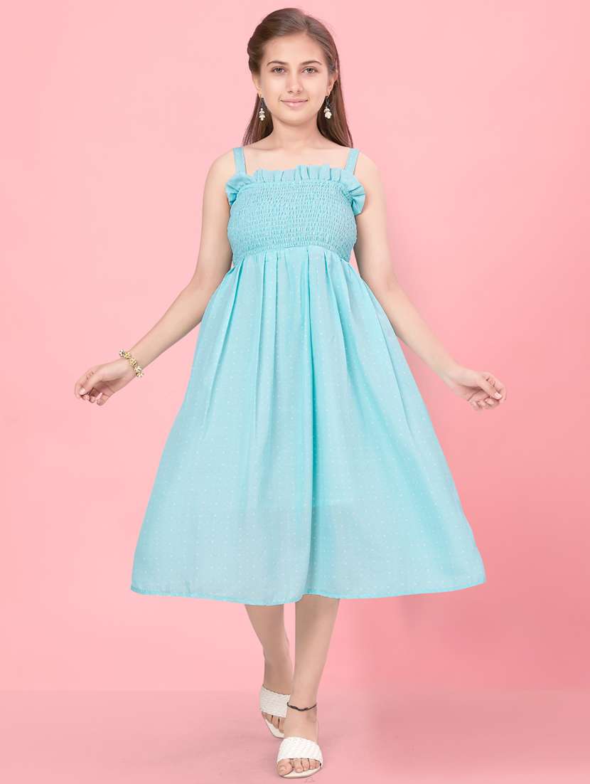 - Dress up your little ones in frocks featuring pretty patterns in cotton blend .