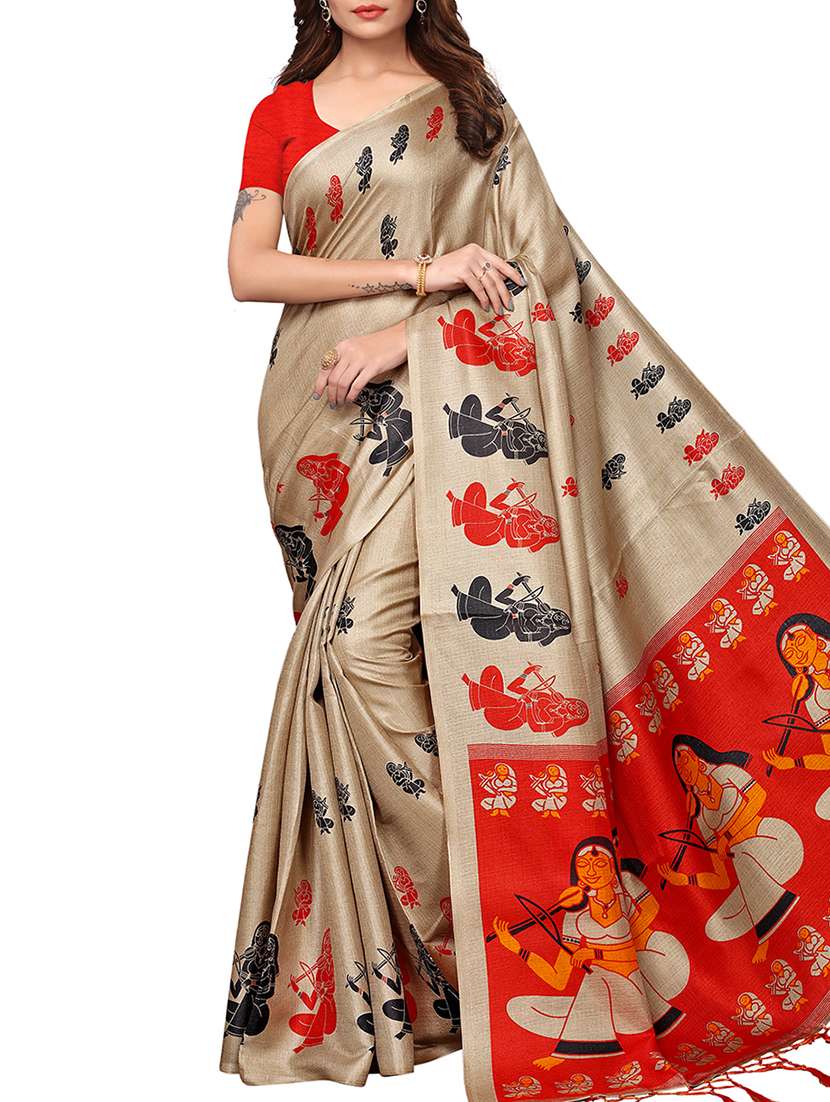Get a stunning ethnic look in this Khadi Art Silk Saree. The Sari with tasteful prints supplements your look while fulfilling a perfect wear. You can team this saree with a smooth traditional earrings and high footwear for an exquisite look. Ideal to wear at office, college, party, etc. Crafted using premium quality, the Saree is light in weight and easy to drape. Fabric : Synthetic. In the Box : 1 Saree with Blouse Piece. Wash Care : Home Washable. Color : Beige & Red. Saree Length : 5.25 mtrs Plus Blouse Piece : 0.70 mtrs. Print Pattern : Ethnic Motifs