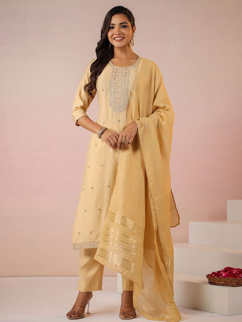 - Find gorgeous sets of ethnic wears in trending designs in beige colors suitable for festive wear of occasions.