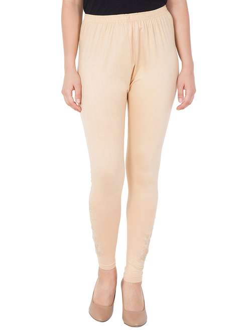 beige solid cotton embroidered leggings