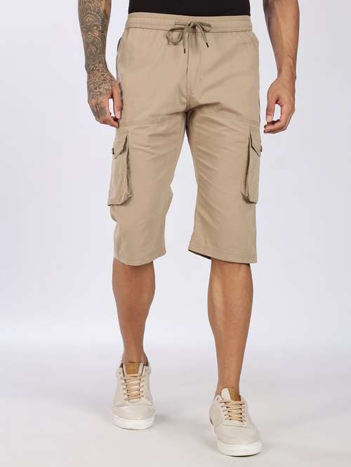 - » men solid mid rise regular fit three fourth cargo shorts