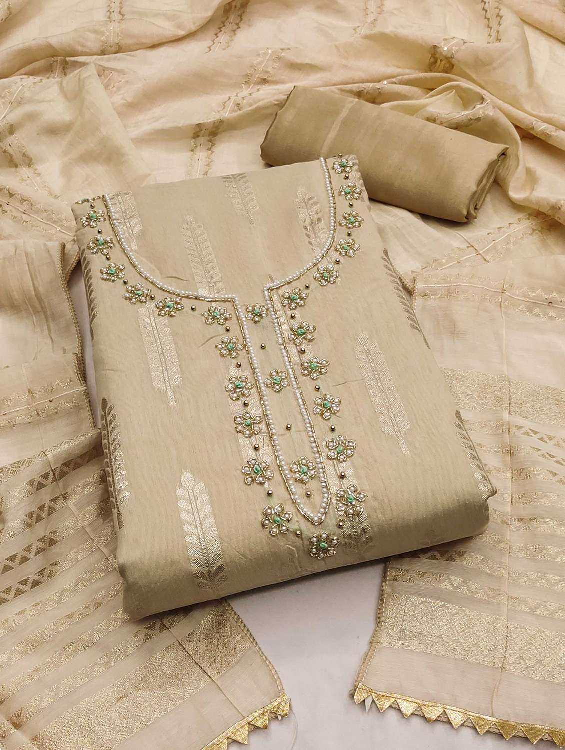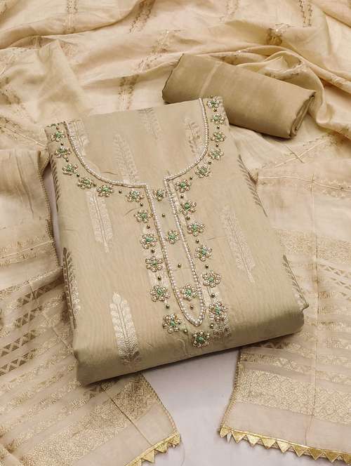 - Look ultra gorgeous in unstitched suits from Leeli Peeri Designer and grab these beautiful suits in beige colour.
