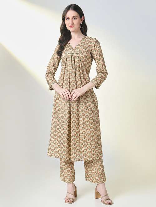 - Find gorgeous sets of ethnic wears in trending designs in beige colors suitable for casual wear of occasions.