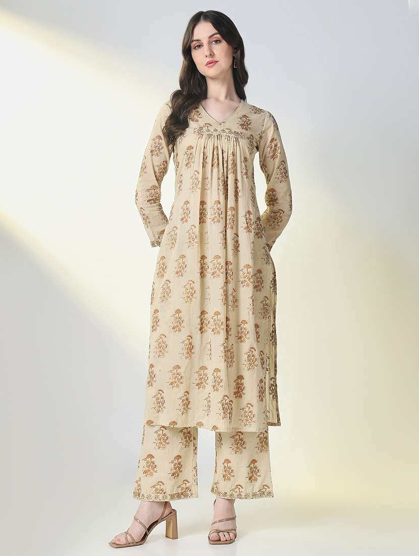 - Find gorgeous sets of ethnic wears in trending designs in beige colors suitable for festive wear of occasions.