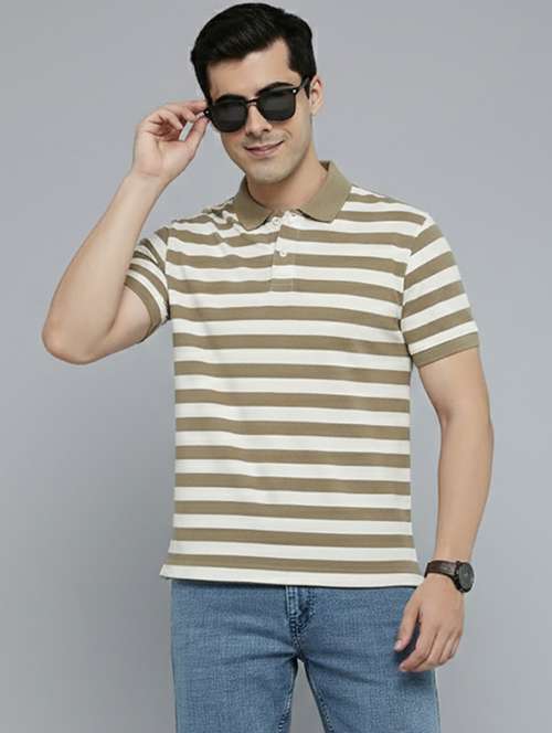 OAKWYN Men's Fawn Cotton Blend Half Sleeves Striper Polo T-shirt