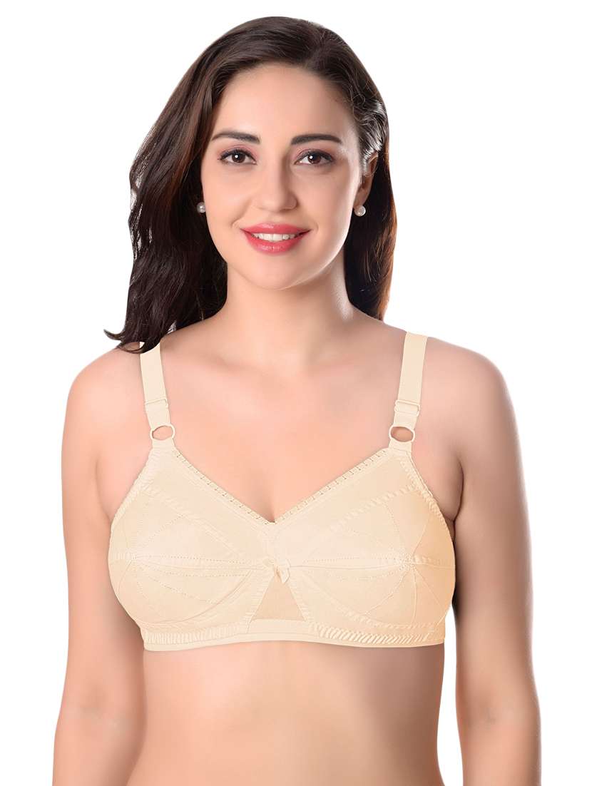 Featherline everyday cotton bras comes with two section cups design gives a classic look and provide extreme comfort. The bra is made from pure cotton fabric. If comfort is your top priority, cotton bras are your thing as they are super soft and absorbent. They don’t irritate your skin or pinch you, making it suitable for lounging around all day. It comes without non padded cups to avoid adding extra bulk at your bust area. The bra offers extreme comfort throughout the day with its non-wired. It has full cups, reinforced seamed, Stitches on the cups and trim lace design on cups for better lift, support and tendy look. The bra is beautified with a bow at the centre gore. bra comes with basic color and wide adjustable shoulder straps for snug fit and everyday use.