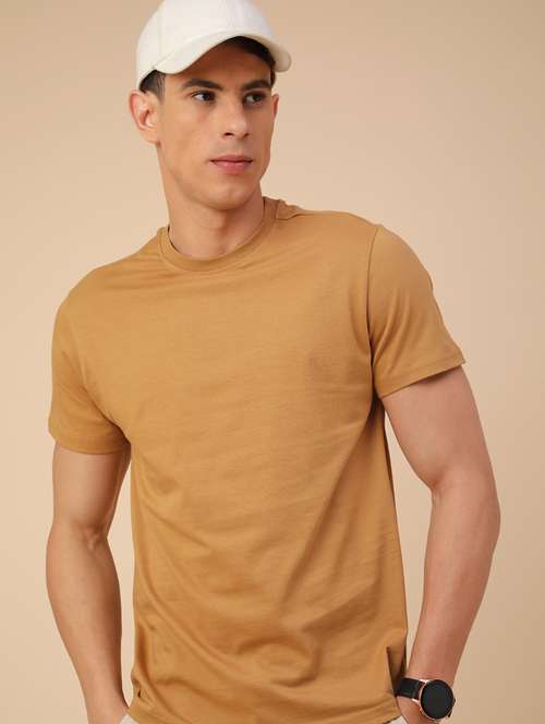 Beige Cotton Regular Fit Round Neck T-Shirt