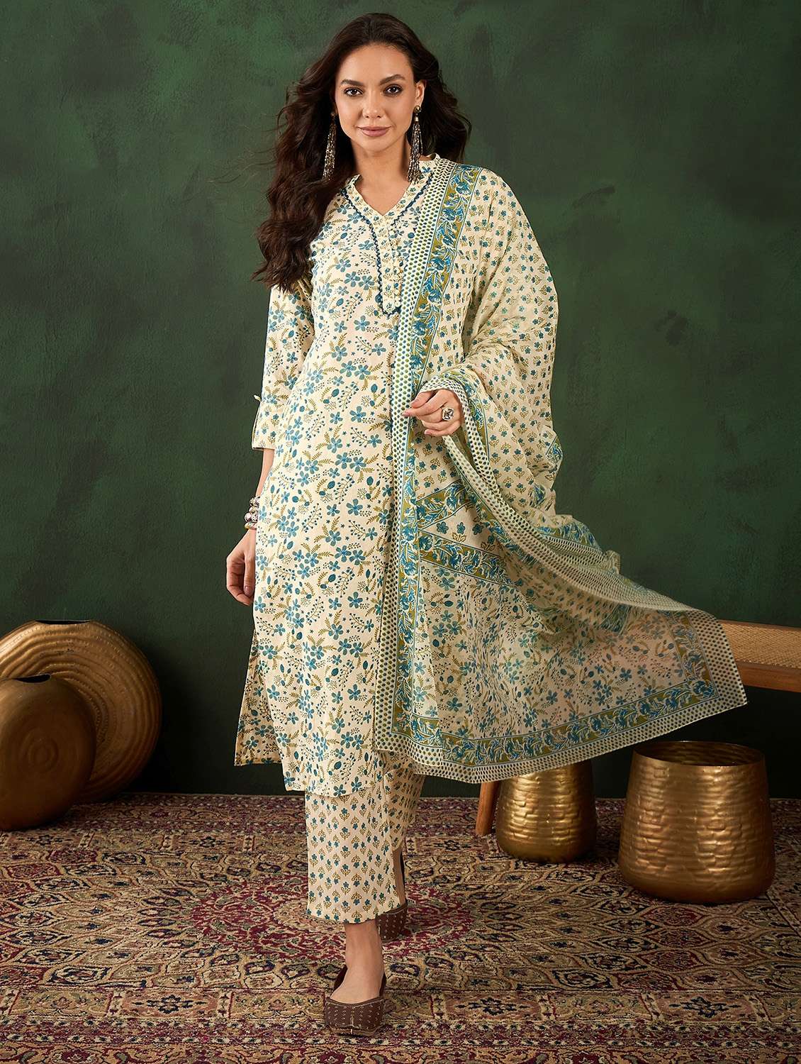 women three quarter sleeve kurta pant with dupatta set