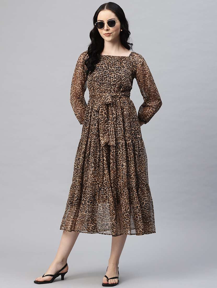 Animal Printed tiered fit & flare dress Square neck Long, puff sleeve Belted detail midi length in flared hem