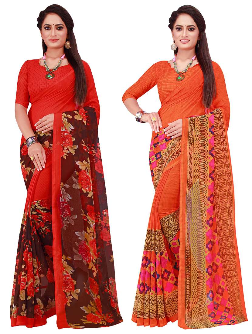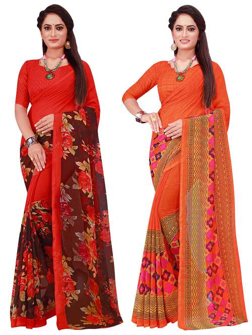 Be the cynosure of all eyes wearing this multi colored printed sarees from the house of Florence. Made of Georgette, this saree will keep you comfortable throughout the day. The fine Work enhances the visual appeal of this saree. each saree measures 5.5 m and it comes with a 0.80 m blouse piece.