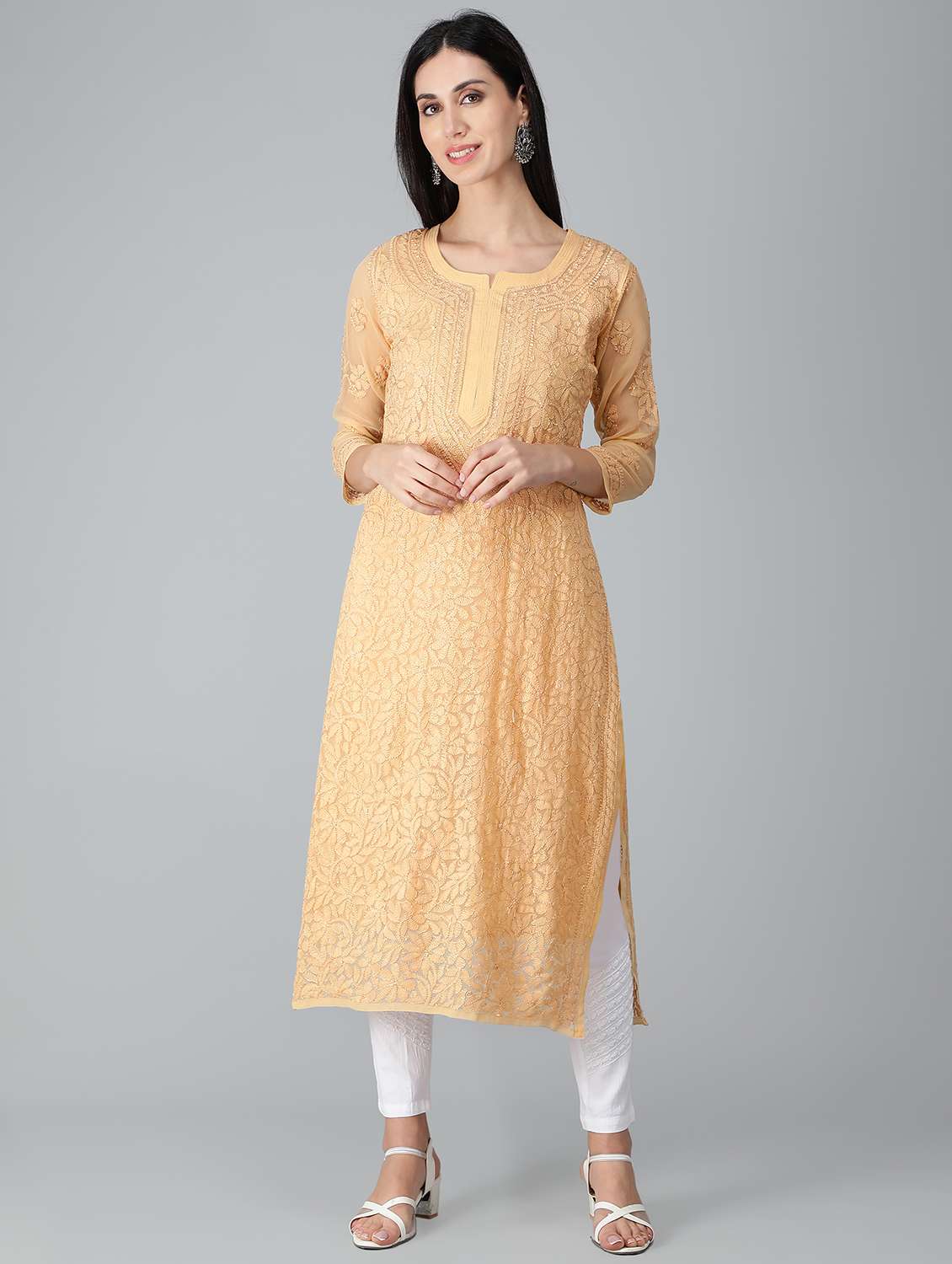 - Grab this beautiful kurta made up of georgette fabric featuring notch neck designs.