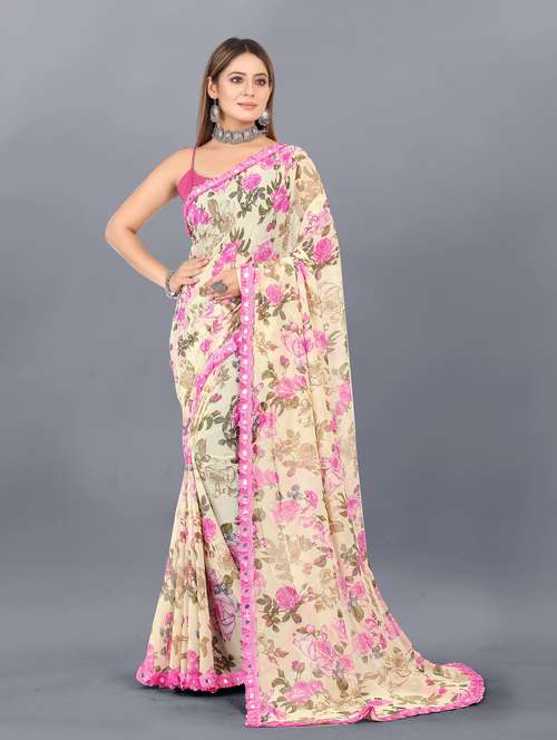 This Trendy Store's beautiful floral printed georgette saree is crafted with superior-quality fabric. The designer embroidered mirror lace border of the saree gives it an elegant touch. The saree perfectly adds charm to your appearance at all special events. Pair this saree with matching jewelry for a head-turning look.