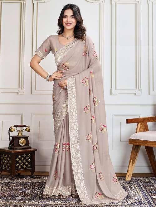 - » women beige embroidered saree with blouse