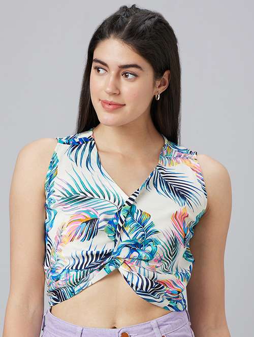 Women off white sleeveless regular fit top has tropical print, V-neck, front twist detail and crop length.