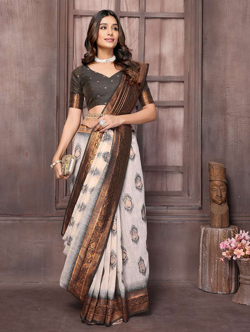 Embrace elegance with this beige cotton-linen blend saree, featuring exquisite woven patterns in black and copper shades on the pallu and borders. This beautiful combination adds a sophisticated touch, making it perfect for both casual outings and festive occasions. Enjoy the comfort and style that this saree brings to your ensemble.