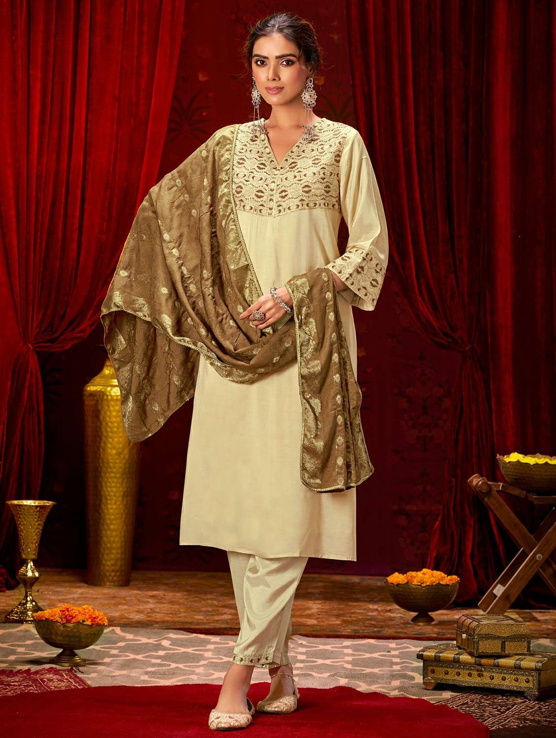 • Find gorgeous sets of ethnic wears in trending designs in beige colors suitable for festive wear of occasions.