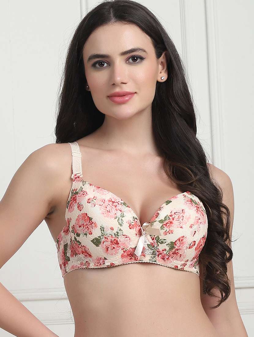 PrettyCat beige bridal bra crafted with exquisite lace fabric. Padded cups to protect modesty. Underwired cups for extra support to lift your cleavage. Full coverage for no top or side spillage. Cute bow in the centre for embellishment. Detachable straps to style the bra in multiple ways. Floral print lace which gives you awasome bridal look.