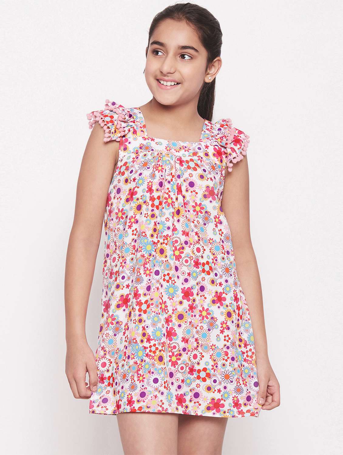 - Dress up your little ones in frocks featuring pretty patterns in polyester .