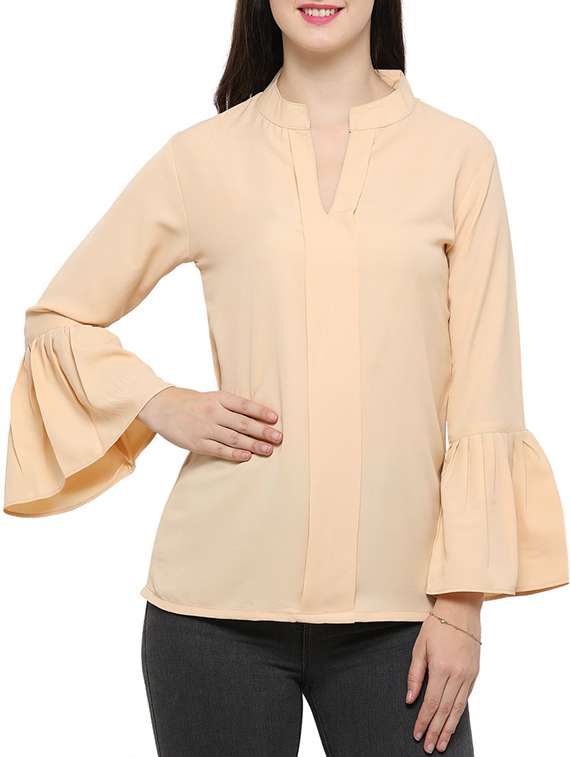 A mandrain collar smarty pants top makes it an ideal choice for workwear as well as casual wear while leaving you look absolutely stunning. This hazel nut color and bell sleeves are very much in this season.