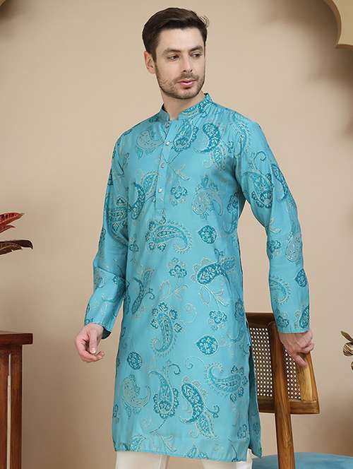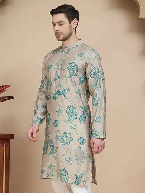 Ethnic fashion with this stylish beige kurta, featuring artistic teal paisley prints that bring a modern twist to a classic look. Made from lightweight, breathable fabric with a mandarin collar and side slits for comfort and ease, it's perfect for daytime functions or intimate celebrations. Team it with white pants and brown slip-ons for a cool, contemporary vibe