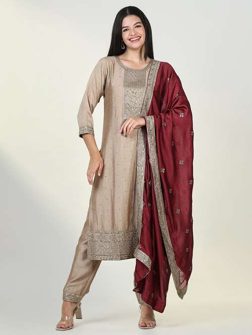 - Find gorgeous sets of ethnic wears in trending designs in beige colors suitable for festive wear of occasions.