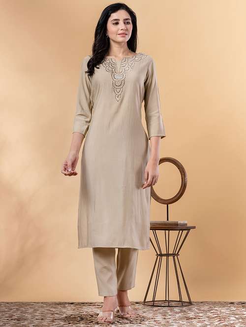 - Find gorgeous sets of ethnic wears in trending designs in beige colors suitable for casual wear of occasions.