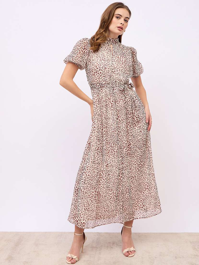 women animal print puff sleeves fit & flare dress