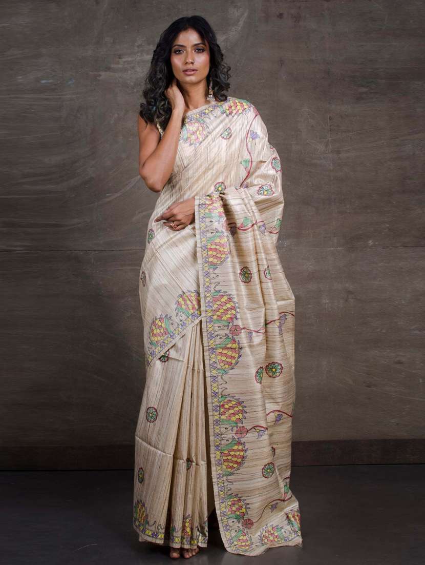 beige madhubani printed saree