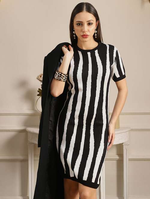 Add a bold touch to your wardrobe with this black and white abstract print mini dress from Globus. Featuring a classic round neck and slim-fit silhouette, it hugs your curves in all the right places. The ribbed hem detail adds texture and a stylish finish. Crafted from soft acrylic knit, this dress offers comfort and style in equal measure. Ideal for casual outings or laid-back weekends