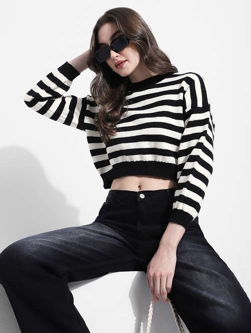 SHOWOFFFF Women’s Striped Black & White Knit Crop Top