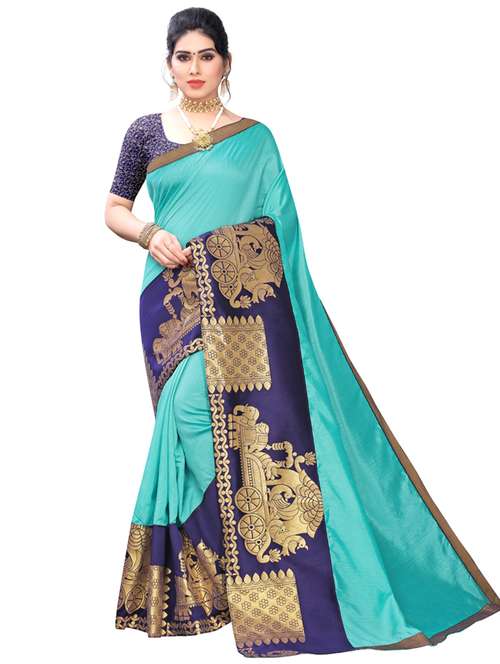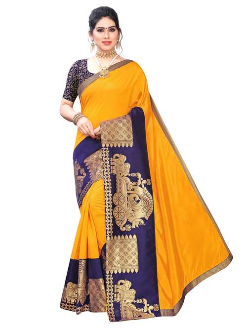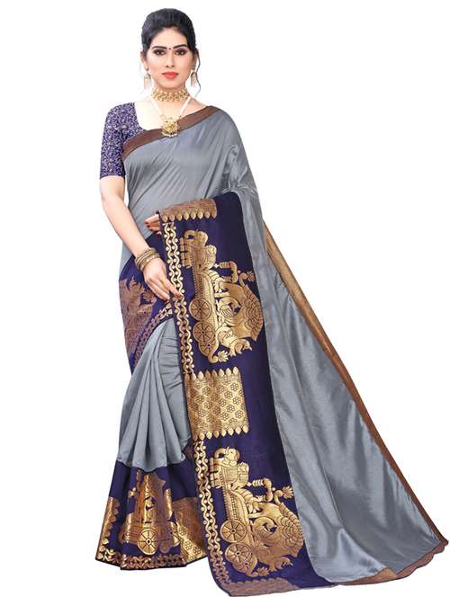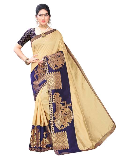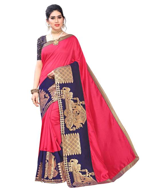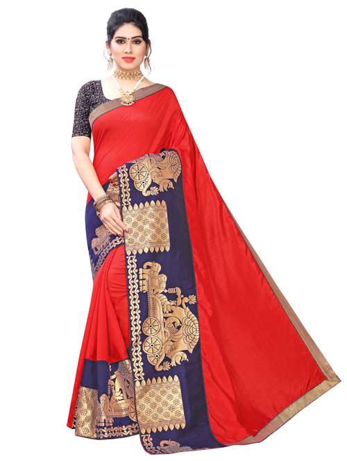Art Silk saree with broad woven borders with chariot pattern. Woven jacquard blouse; Material Measurements: 5.5 m long & 112 cm wide saree. Blouse length - 80 cm; This casual wear saree is stiff, comfortable and lends a formal look; Ideal if you are looking for sarees for women party wear, printed sarees, fancy sarees, plain sarees, latest sarees, daily wear sarees, cotton sarees, bhagalpuri sarees, bhagalpuri cotton silk sarees, art silk sarees, soft sarees; Care Instructions: Hand Wash or Mild Machine Wash is recommended. Colours do not bleed