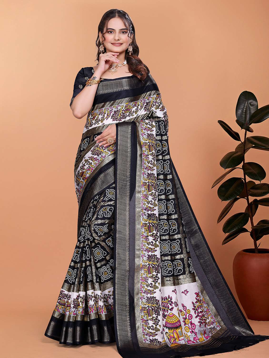 - » women bandhani printed bordered saree with blouse