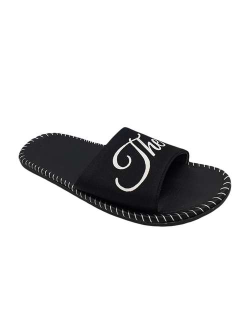 black fabric slip on flip flops
