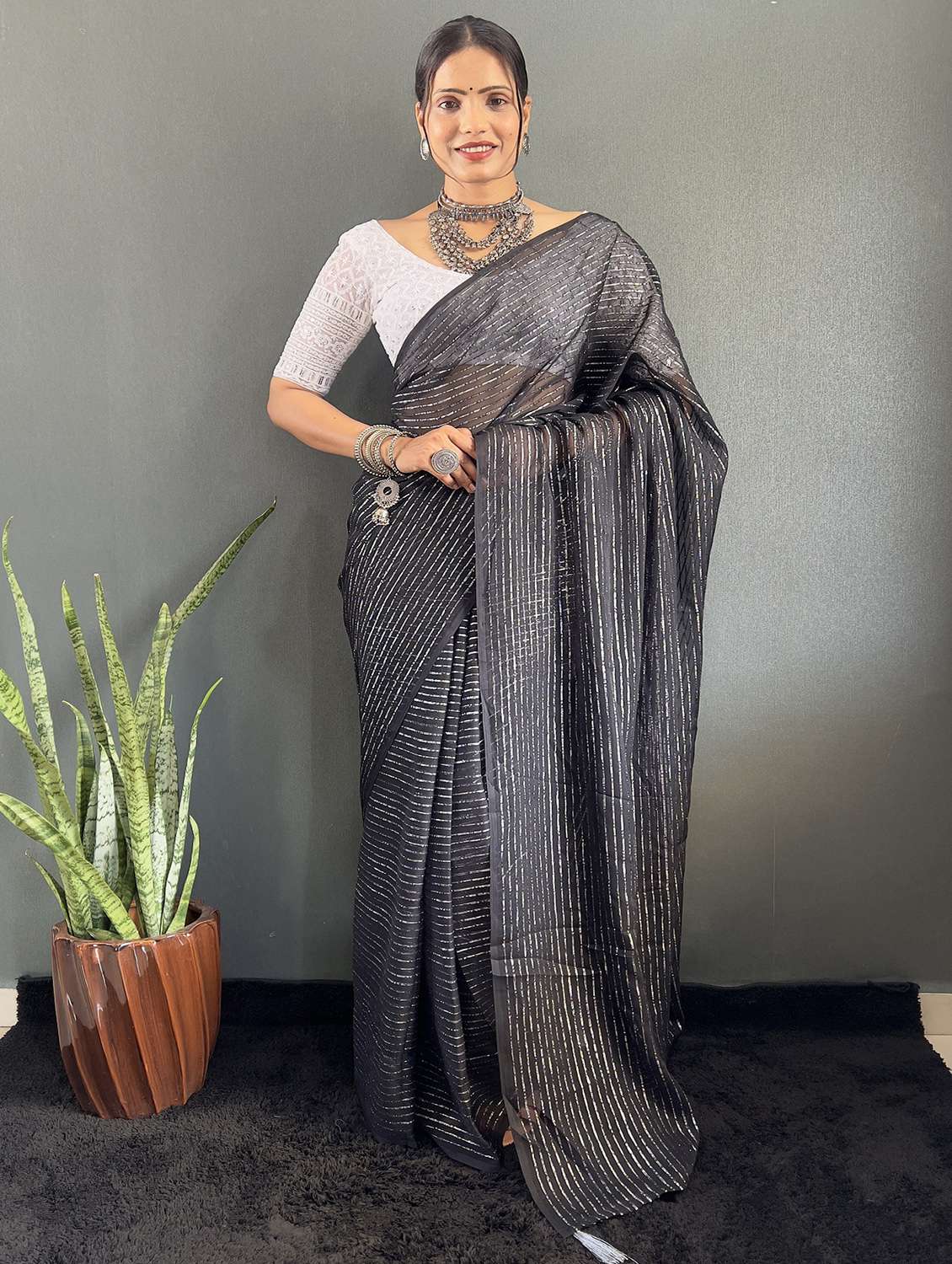 Color : Black, Made from high quality Chiffon Fabric Striped Saree, giving the saree a stunning look and feel.With a length of 5.25 meters and an additional 0.80 meters of Cotton Striped Chinakari Work unstitched blouse material, this saree offers ample fabric to create your perfect look.Available in various colors, this saree is perfect for weddings, parties, and other special occasions. Order now and make a fashion statement with this beautiful saree.