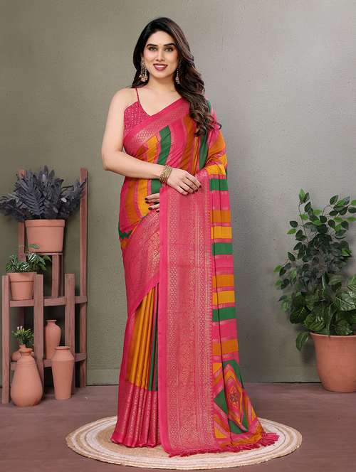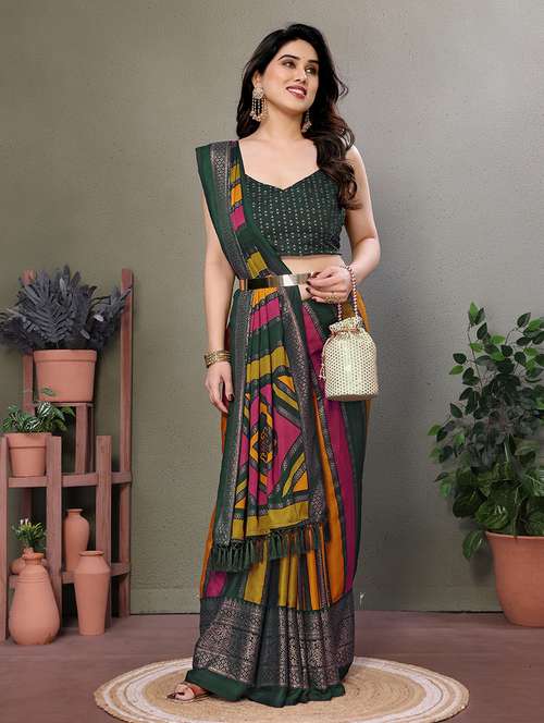 This exquisite saree features a vibrant bright moss stipe design complemented by an abstract print, creating a stunning visual appeal. The intricate foil work adds a touch of elegance, making it perfect for both festive occasions and formal gatherings. Crafted from high-quality fabric, this saree drapes beautifully, ensuring comfort and style. Elevate your wardrobe with this unique piece that effortlessly blends tradition with contemporary flair.