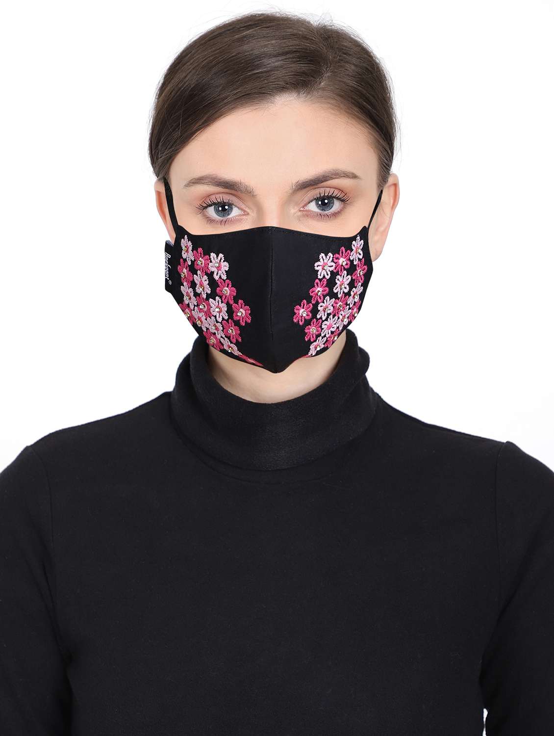 Anekaant 3-Ply Reusable Black & Pink Floral Embroidered Cotton Fabric Fashion Mask