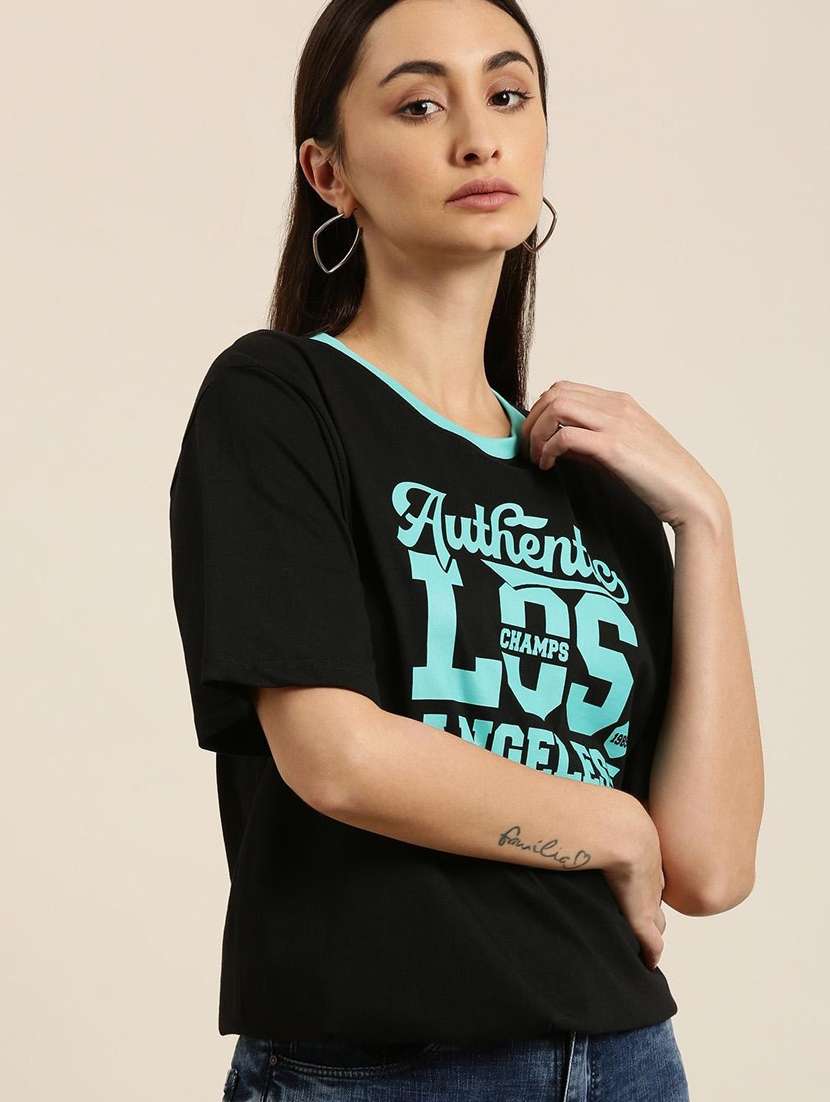 - » black front print detailed oversized round neck t-shirt