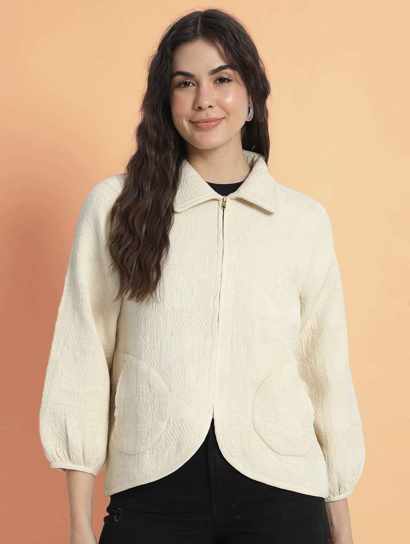 - » women self design three quarter sleeves jacket