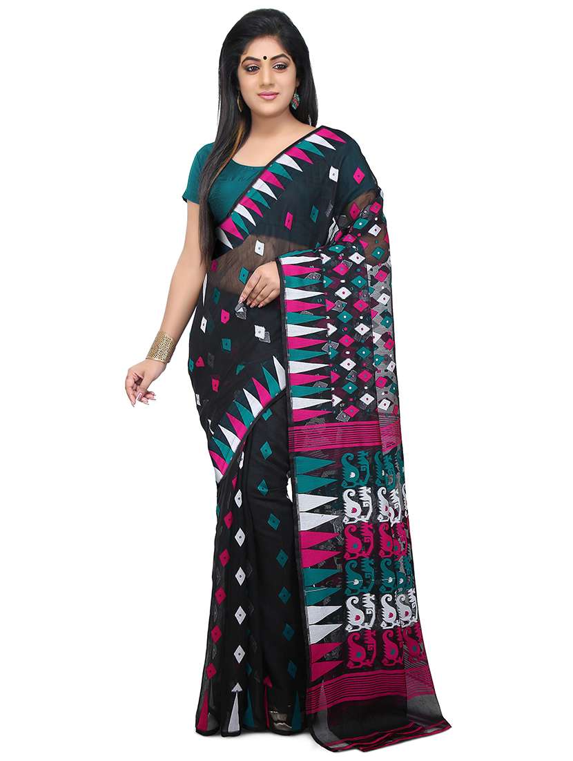 - » women black self design jamdani saree with blouse