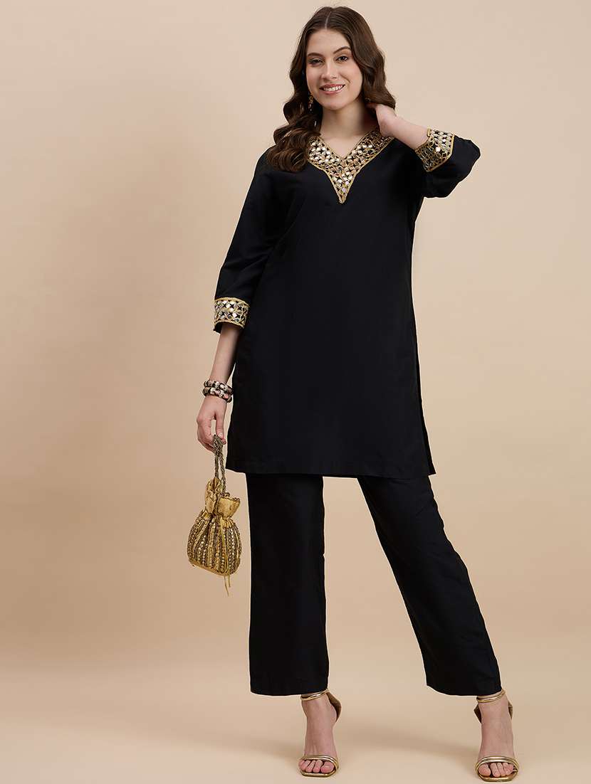 - » women black mirror work v neck co-ord sets