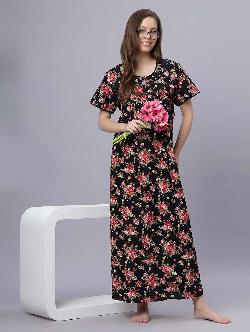 Quira Comfortable Women's Full Length Cotton Blend Half Sleeves Nighty, Soft and Elegant Printed
