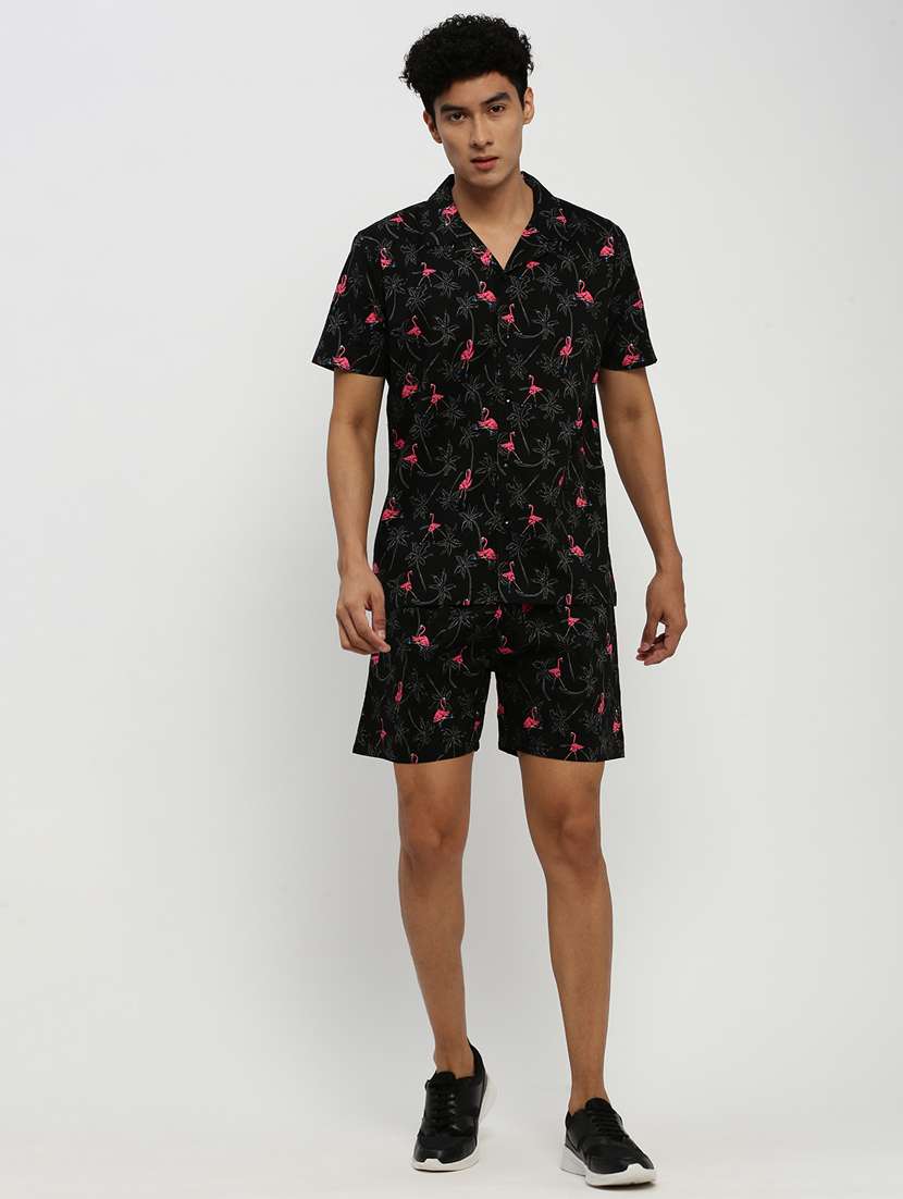 SHOWOFF Men's Short Sleeves Printed Black Cuban Collar Co-Ords Set