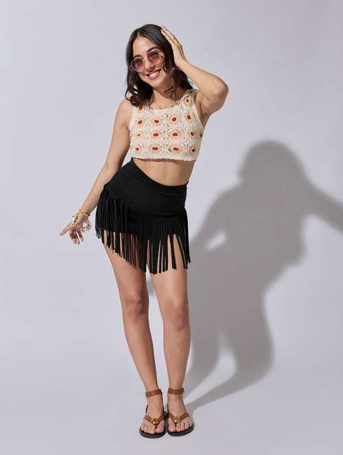 - » women solid high rise bodycon skirt with fringes