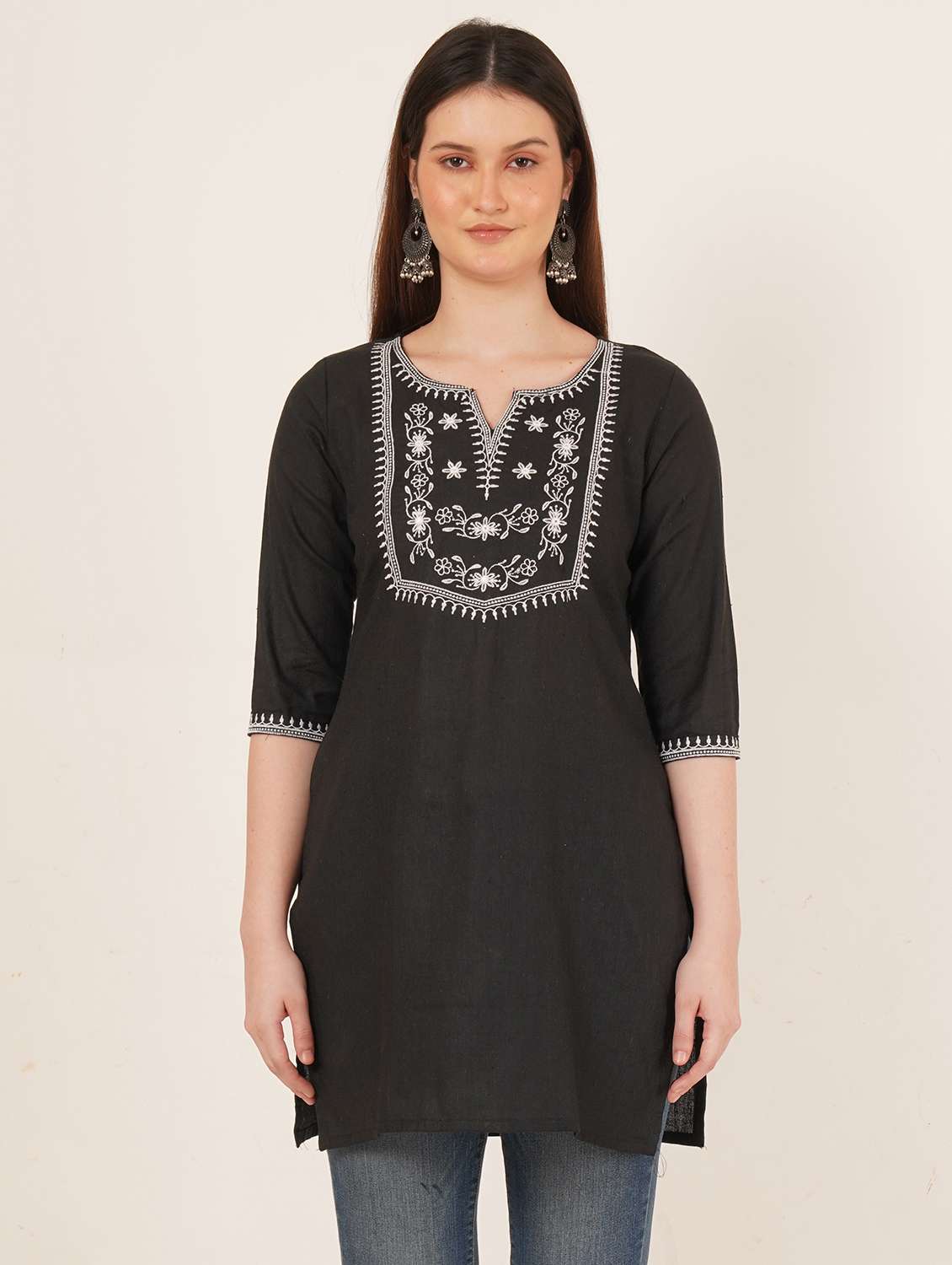 women embroidered three quarter sleeve straight kurti