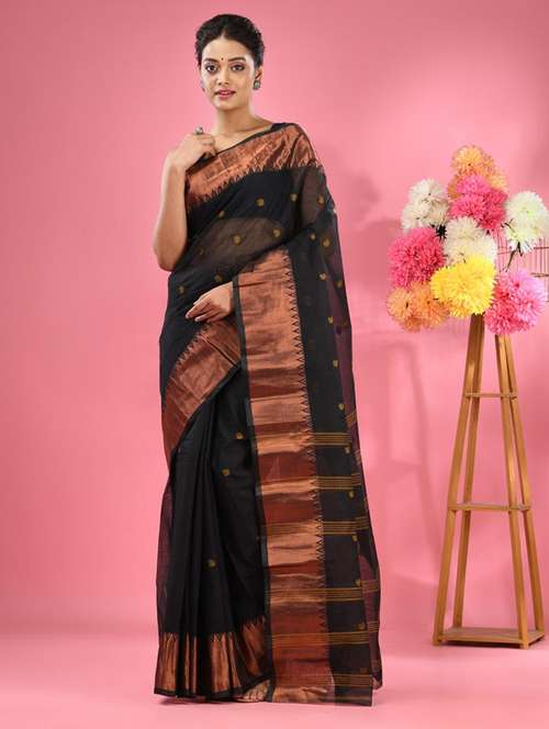 Get a poised and dainty look in this black pure cotton tant saree. It has woven designs and patterns all over for a beautiful look.
