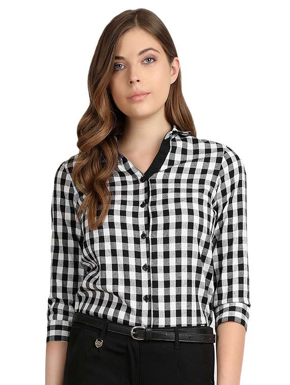 - » curved hem chekered shirt