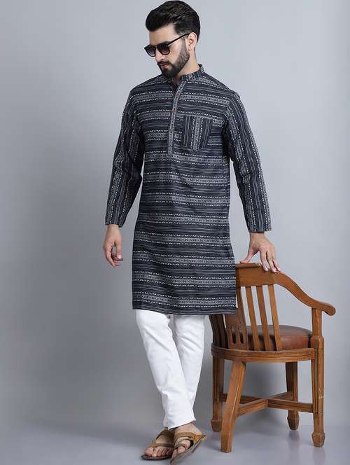 Enchanted Drapes Grey Printed Men's Cotton Long Kurta