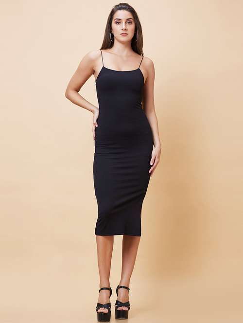 Globus presents these fashionable and classy Women Black Solid Strappy Casual Midi Bodycon Dress. Made with superior quality skin friendly Cotton fabric for comfort of wearing. The Casual Dress are sure to keep you looking stylish and feeling comfortable through the day. So go ahead, stand apart from the crowd and create your own trends.