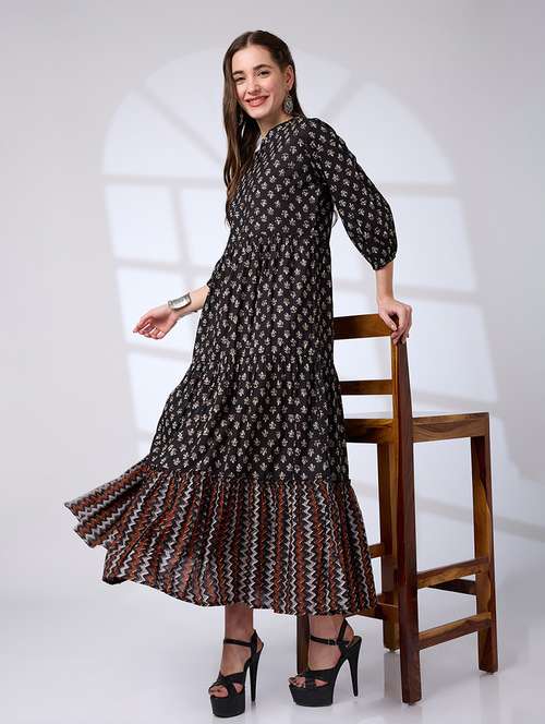 - » globus women black cotton mandarin collar bishop sleeve ethnic print tiered a-line work wear maxi dress